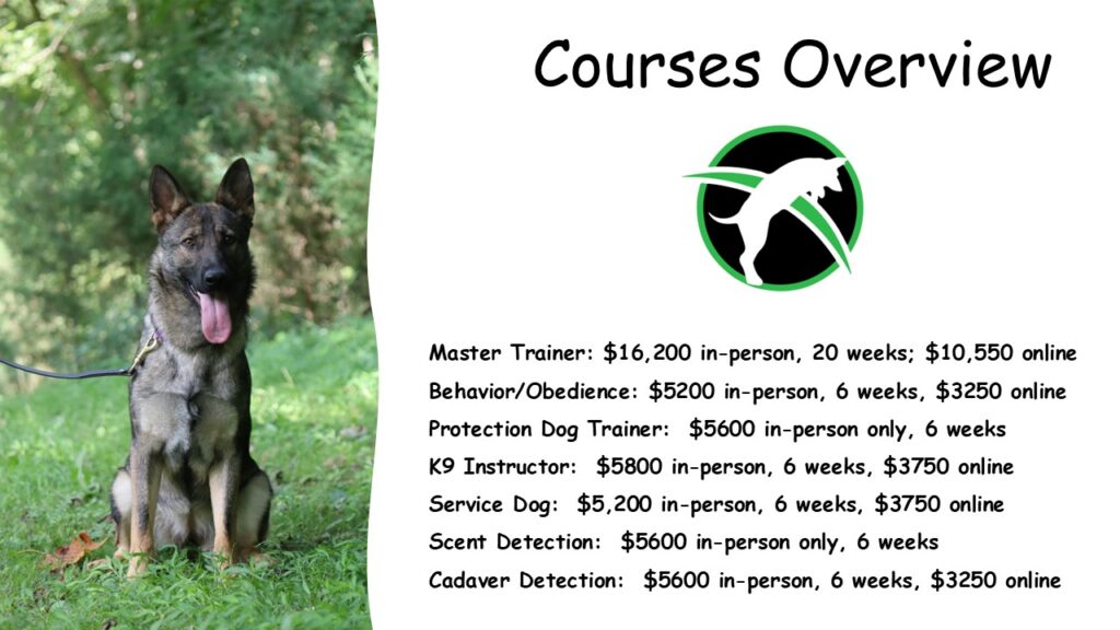 These dog trainer courses are designed for students who desire to train dogs on a professional level. They are collegiate-level courses that are far more than a backyard hobbyist’s level, with a focused concentration on the various aspects of training. Our Instructors are good at training dogs and also get along with people (that’s a hard blend to find lol).